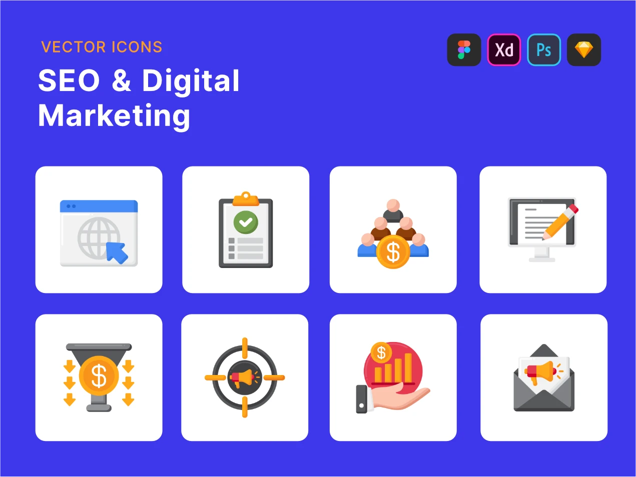 SEO Icon Vector adalah sebuah produk desain vektor yang dirancang khusus untuk aplikasi Sketch, XD, Adobe Photoshop, Adobe Illustrator, dan Figma. Produk ini memudahkan Anda untuk membuat desain yang berkaitan dengan bisnis atau startup dengan mudah dan cepat. Setiap elemen dalam desain telah dikelompokkan berdasarkan layer dan diberi nama sesuai fungsinya, sehingga memudahkan Anda untuk melakukan modifikasi sesuai dengan kebutuhan. Produk ini sangat cocok bagi Anda yang ingin membuat desain yang efisien dan efektif dalam waktu yang singkat. Dengan Desain Vector ini, Anda dapat dengan mudah mengedit warna, font, dan elemen desain lainnya untuk menciptakan tampilan yang sesuai dengan kebutuhan Anda. Desain yang fleksibel ini dapat digunakan untuk berbagai kebutuhan desain, mulai dari desain logo, brosur, sampai presentasi bisnis.